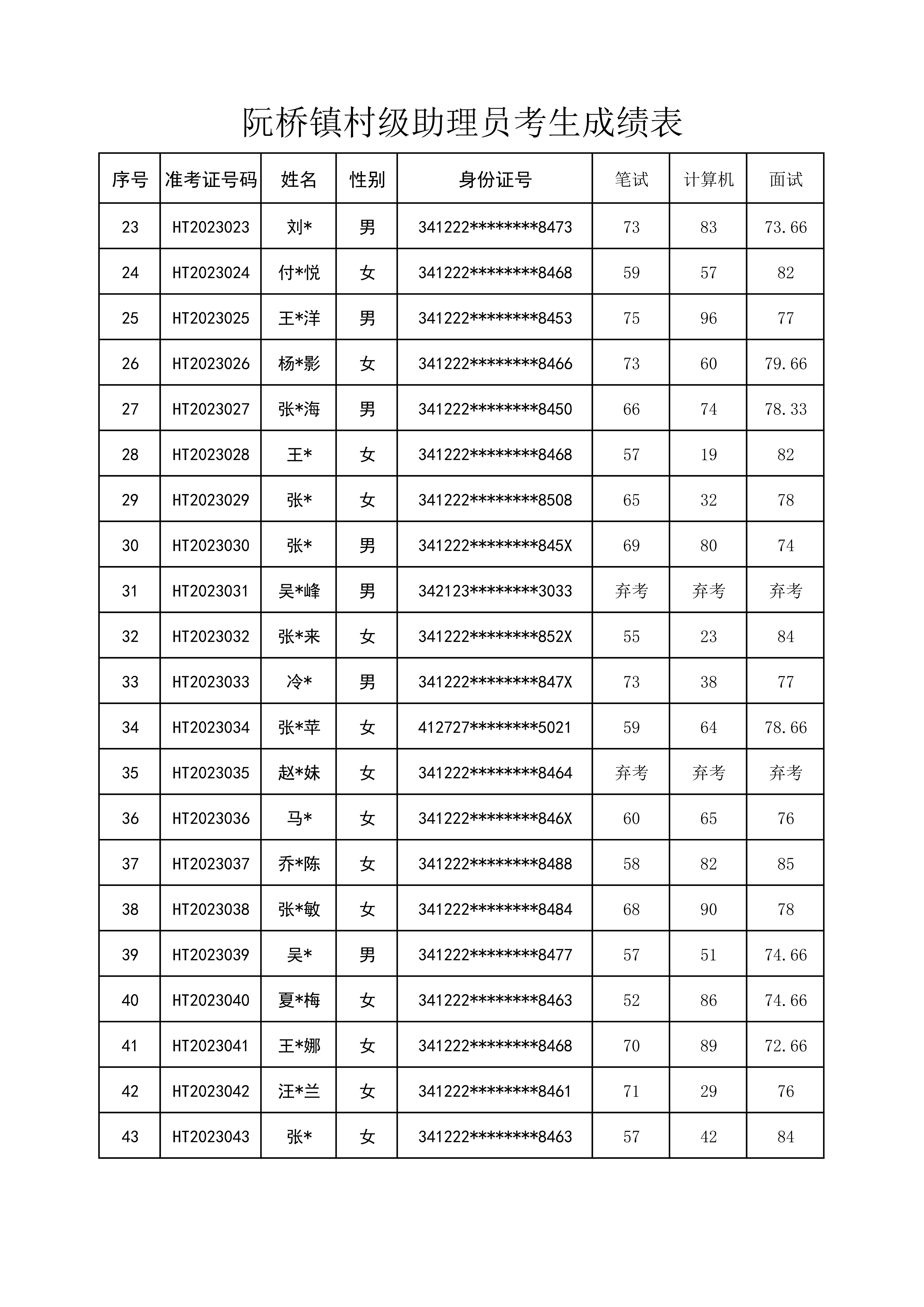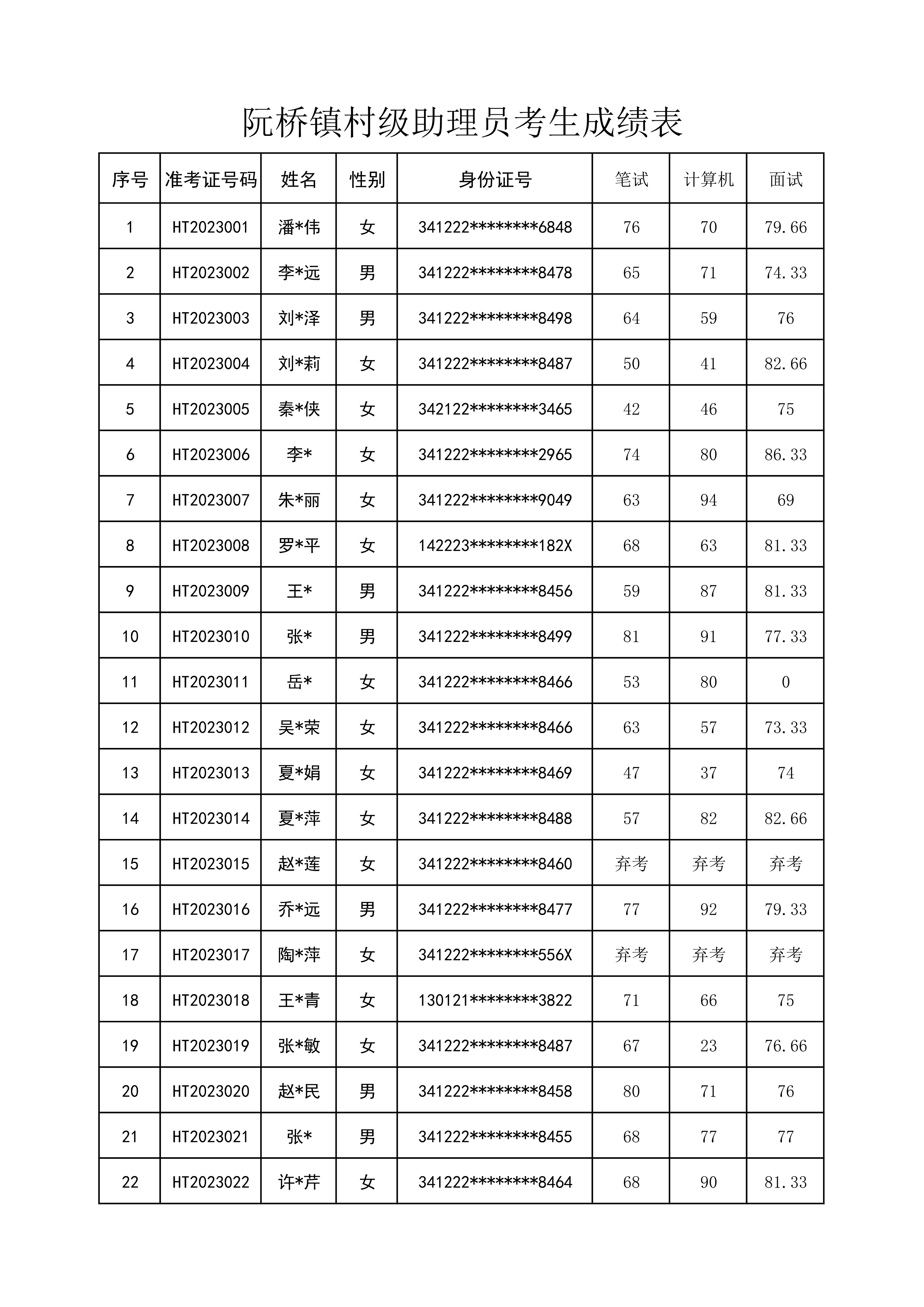 根據《阮橋鎮(zhèn)2023年村級助理員招聘公告》要求,經過報名、資格審查、筆試、計算機操作、面試等程序,現(xiàn)將筆試、計算機操作、面試成績予以公示(詳見附件),公示時間2023年6月20日至24日。