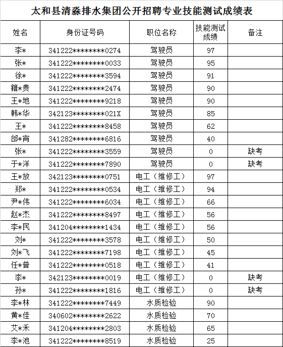 太和縣清淼排水集團(tuán)有限公司公開(kāi)招聘18名工作人員專(zhuān)業(yè)技能測(cè)試成績(jī)公示