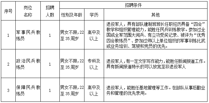 4.能勝任民兵訓(xùn)練教學(xué)、學(xué)生軍訓(xùn)、基地管理等工作;