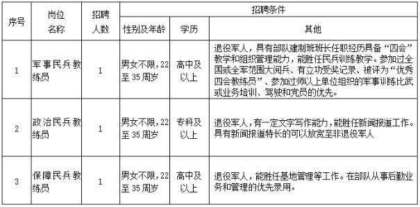 根據(jù)工作需要和有關(guān)規(guī)定,受太和縣人民武裝部委托,我公司決定面向社會(huì)招聘民兵專職教練員3名,現(xiàn)將有關(guān)事項(xiàng)公告如下: