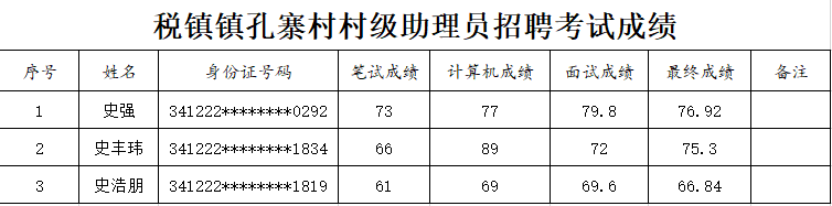 附件:稅鎮(zhèn)鎮(zhèn)孔寨村村級助理員招聘考試成績表