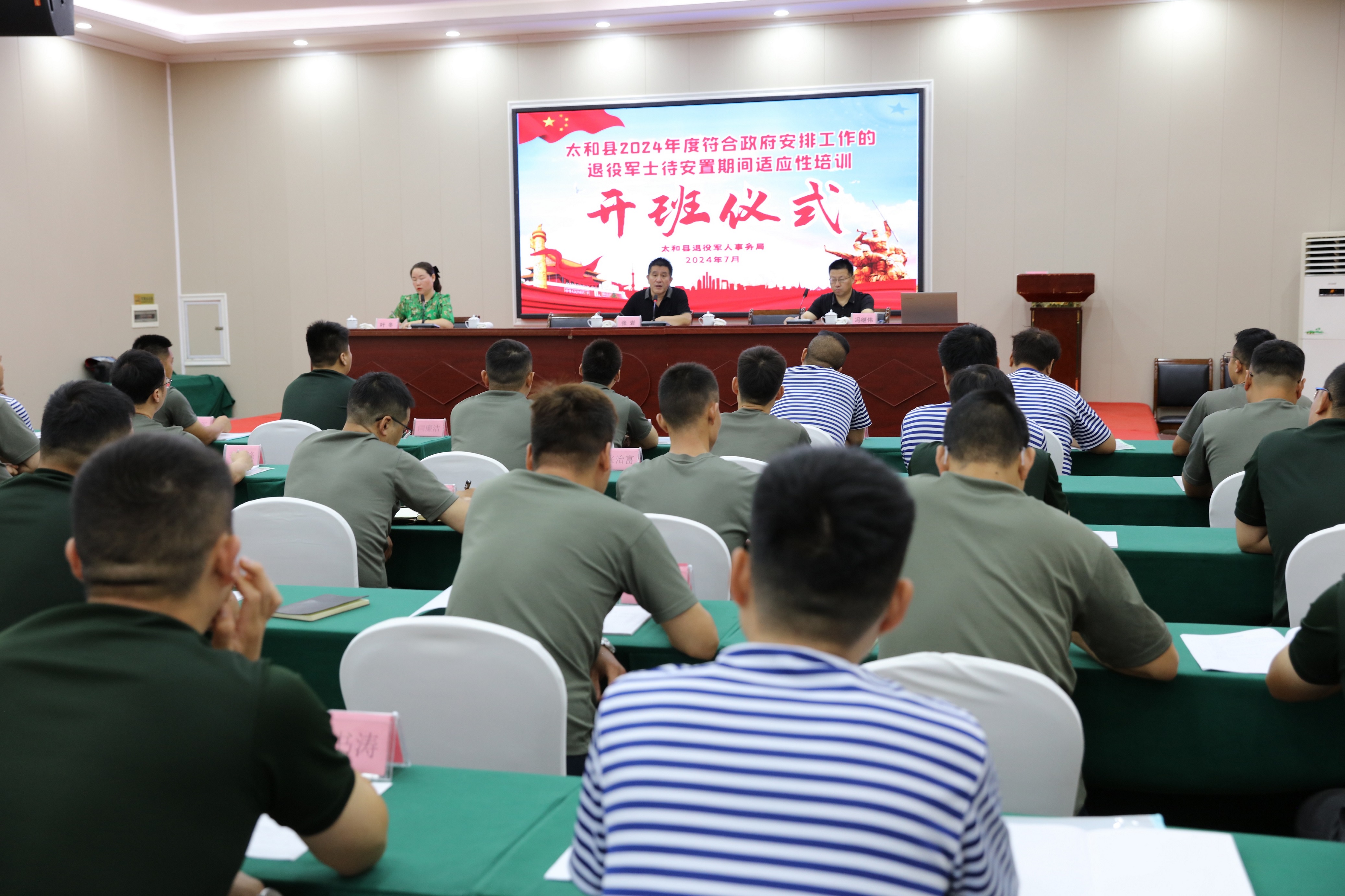 7月19日,太和縣2024年退役軍士崗前適應(yīng)性培訓(xùn)班開班儀式在太和縣鏡湖賓館舉辦,助力43名退役軍士從軍營(yíng)到地方經(jīng)濟(jì)建設(shè)華麗轉(zhuǎn)身。本次培訓(xùn)由太和縣退役軍人事務(wù)局、太和縣和泰人力資源公司聯(lián)合組織舉辦。阜陽市退役軍人事務(wù)局黨組成員、副局長(zhǎng)程龍,太和縣退役軍人事務(wù)局黨組書記、局長(zhǎng)蔣利民,副局長(zhǎng)張巖等有關(guān)負(fù)責(zé)人參加開班儀式。