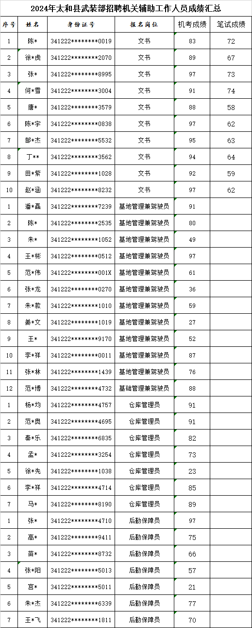 根據(jù)《2024年太和縣武裝部招聘機(jī)關(guān)輔助工作人員公告》等有關(guān)規(guī)定,筆試、機(jī)試工作已圓滿結(jié)束,現(xiàn)將考生成績予以公示(見附件)。