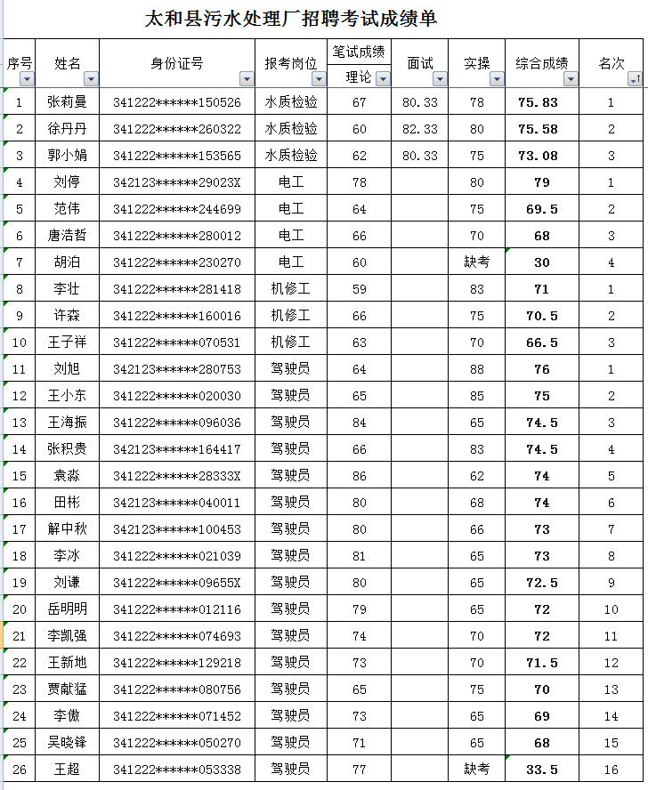 根據(jù)《太和縣污水處理廠公開招聘工作人員公告》相關(guān)要求,本著“公開、公平、競(jìng)爭(zhēng)、擇優(yōu)”的原則,由太和縣和泰人力資源組織,太和縣住建局、太和縣紀(jì)委監(jiān)委駐住建局紀(jì)檢組、太和縣污水處理廠等有關(guān)部門監(jiān)督指導(dǎo)的實(shí)操考試已圓滿結(jié)束,現(xiàn)將考生成績(jī)予以公示,接受社會(huì)監(jiān)督。