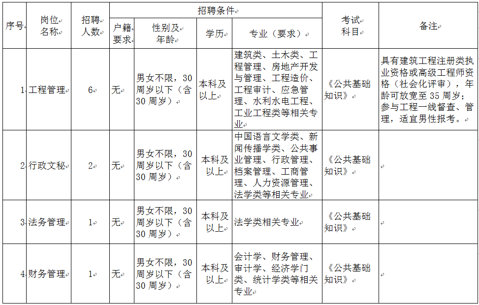 本次計(jì)劃招聘10名工作人員,其中:工程管理崗位6人,辦公室文秘2人、財(cái)務(wù)管理1人、法律工作人員1人,各崗位具體招聘條件見(jiàn)下表