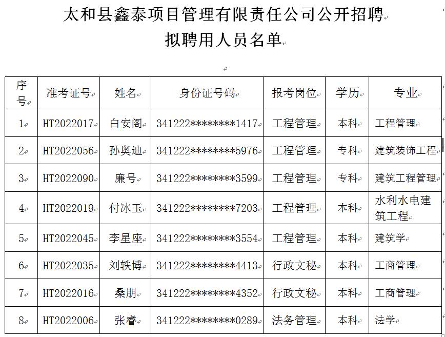 根據(jù)《太和縣鑫泰項(xiàng)目管理有限責(zé)任公司招聘勞務(wù)派遣制工作人員公告》的招聘要求,經(jīng)報(bào)名、資格審查、筆試、面試、體檢、考察等程序,白安閣等8名考生符合本次聘用條件,擬聘用為太和縣鑫泰項(xiàng)目管理有限責(zé)任公司勞務(wù)派遣制員工?,F(xiàn)將擬聘用人員名單(見(jiàn)附件)公示7天,公示時(shí)間從2022年9月7日至2022年9月13日。如有問(wèn)題,請(qǐng)于公示期間及時(shí)向有關(guān)部門(mén)反映。